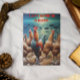 Uma pintura vibrante, com um grupo de galinhas vivas a piscar num campo iluminado pelo sol, a bicar no chão e a abanar as penas.