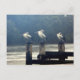 Três pelicanos em três pilões de cais
