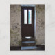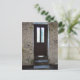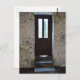 Porta de madeira marrom fechada com a luz do sol a passar pela janela de vidro, contra uma parede tradicional de pedra branca, com tinta decapante, no estilo tradicional irlandês. Tirada na Abadia de Kylemore, em County Galway, Irlanda.