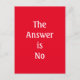 A resposta é não design de tipografia. Inscrição branca num fundo vermelho. Envie esta mensagem a qualquer um para responder a sua pergunta! Coloque na sua mesa e segure quando seu chefe falar com você! Personalize facilmente este cartão editando o texto do modelo para uma mensagem de sua própria escolha.