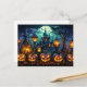 Este cartão-postal incrível apresenta uma moradia assombrada alinhada com abóboras bem iluminadas.