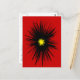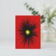 Este postal apresenta um desenho abstrato dramático de uma flor preta com um centro amarelo ouro sobre um fundo vermelho escarlate.