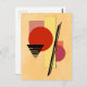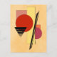 Um triângulo preto dividido em segmentos, uma banda trapezoidal preta dividida em duas, um círculo vermelho, um retângulo amarelo, um quadrado vermelho pálido, um círculo roxo, e uma característica quadrada laranja nesta arte abstrato de sobreposição de formas por Richard H. Fay.