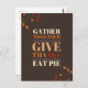Este moderno cartão postal de Ação de Graças apresenta um design de tipografia ousado e na moda com as frases "Juntar, Juntar Obrigados, Comer Pizza" em cores quentes do outono. O fundo castanho escuro e os sotaques mínimos das folhas e bagas acrescentam um toque contemporâneo, fazer perfeito para enviar cartões de natal festivos com uma mensagem divertida e voltada para a família.