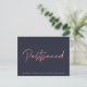 Adiamento de Casamento de Folha Ouro Minimalista ou Cartão Postal de Alteração de Data com a inscrição de script de tendência em uma folha de rosa de ouro falsa em um fundo azul de marinho para que seus convidados saibam que seus planos mudaram. Se precisar de assistência ou itens correspondentes, entre em contato conosco em cedarandstring@gmail.com