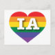 Este cartão-postal apresenta um coração com um design de orgulho arco-íris e as letras IA. Além das listras, dentro do coração estão as letras maiúsculas IA, a abreviação oficial do estado de Iowa, em uma letra branca em negrito. O reverso do cartão é vazio, aguardando seu texto personalizado ou sentimentos manuscritos. Mostre suas cores verdadeiras, apoie a igualdade do casamento e comemore a orgulho gay.