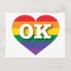 Este cartão-postal apresenta um coração com um design do orgulho arco-íris e as letras maiúsculas, brancas e em negrito OK, a abreviação oficial de Oklahoma, o estado mais rápido. O reverso do cartão postal é vazio, aguardando seu texto personalizado ou sentimentos escritos à mão. Mostre suas cores verdadeiras, apoie a igualdade do casamento e comemore a orgulho gay.