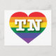 Este cartão-postal apresenta um coração arco-íris contendo as letras maiúsculas, em negrito, branco, TN, a abreviação oficial do Tennessee, o estado do Voluntário. O reverso da placa é vazio, aguardando seu texto personalizado ou sentimentos escritos à mão. Mostre suas cores verdadeiras, apoie a igualdade do casamento e comemore a orgulho gay.