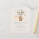 Este cartão postal de chá de fraldas bonito apresenta um doce ursinho de cor d'água em um balão de ar quente azul e branco listrado, acima das palavras "Aventura aguarda!" em um roteiro azul empoeirado de retrô. Personalize o texto com o nome da futura mãe no script e os detalhes na fonte sans serif em um fundo bege.