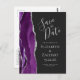 Este elegante e moderno salve a data do cartão postal apresenta uma cor d'água púrpura e borda agitada com falso brilho prateado. O texto personalizável é a cinza prateada clara sobre um fundo preto ardente. O verso repete as informações, juntamente com um endereço de retorno personalizável.