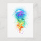 Água-viva grande, iridescente, desenhada artisticamente, brilhante, com longos tentáculos em branco, pintada sobre fundo de aquarela multicolorido. Água-viva arco-íris.