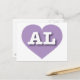 Este cartão-postal apresenta um coração lavanda contendo as letras maiúsculas, brancas e em negrito AL, a abreviação oficial para Alabama, o estado do amarelão. O reverso do cartão postal é vazio, aguardando seu texto personalizado ou sentimentos escritos à mão. Roll Tide!