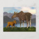 Mama alce e bezerro num prado verde; um lago e montanhas estão ao fundo.