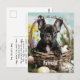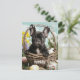 A frente da placa apresenta uma cena adorável de um Bulldog francês preto sentado em dentro a uma cesta de Páscoa tecida. Ao redor da cesta estão uma série de ovos coloridos de Páscoa, cada um vibrante e alegre contra o pano de fundo. O francês veste uma expressão brincalhona, seus olhos brilhando com entusiasmo Páscoa enquanto sai do cesto