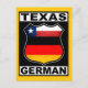 Design alemão do Texas, ao estilo de um legal sinal de estrada americano. O texto Texas German está no topo e no fundo, com a bandeira do Estado do Texas e a bandeira da Alemanha dentro. Excelente para Texanos de ascendência alemã, e para ex-pats no Estado Estrela Solitária.