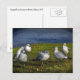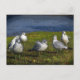 Este cartão mostra seis cinzas e gaivotas brancas reunidas na grama verde em um dia ensolarado na costa do lago de Cayuga. A água azul convidativa está além deles. O lago Cayuga é o mais longo dos lagos glaciais de Dedos do centro de Nova York. A cidade de Ithaca fica no extremo sul.