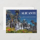 Este cartão-postal de Alicante mostra a principal esplanada arborizada de Alicante e os nomes da cidade em várias línguas, incluindo latim, grego e árabe, representando as cidades história antiga e diversa.