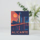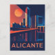 Uma ilustração vibrante e colorida do horizonte Alicante no pôr do sol. A imagem mostra os icônicos arranha-céus e edifícios da cidade silenciados contra um céu laranja feroz. A água reflete as matizes quentes do pôr do sol, criando uma cena serena e cativante.