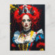 Imaginando Alice como a fantasia da Rainha Vermelha IA gerou arte nas cores vermelha, azul, amarela, preta e branca com cinzas de tinta.