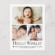 Celebre sua nova chegada com este cartão postal de anúncio de nascimento de bebê "Hello World", com três slots de fotos personalizáveis. Compartilhe o nome do seu bebê, estatísticas de natalidade, e uma mensagem sincera com amigos e familiares num formato limpo e moderno.