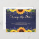 Este design rústico campestre apresenta luzes de corda douradas e renda, juntamente com girassóis e raminhos de lavanda contra um fundo de madeira de celeiro azul marinho. O texto personalizável aparece em dourado pálido na frente, em tipografia de roteiro e serifa populares. O texto no verso é azul marinho para combinar com a madeira na frente. Você pode personalizar este cartão-postal de alteração de data para o seu próprio casamento alterando o texto no modelo.