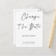 Estas personalizadas modernas e simples Alterações nas Cartões de Data são uma forma elegante de notificar os seus convidados da sua mudança de data. Os design modernos apresentam Mudar a Data, suas palavras, nomes e data especial em script e tipografia ousada. As costas têm um bilhete para a sua família e amigos. Clique em "personalizar este modelo" para mudar todo o texto para o seu. Por favor, veja nossos outros designs correspondentes na nossa loja. Se precisar de ajuda com a personalização ou solicitações especiais, envie um e-mail para o site @gmail.com. Obrigados para parar em www.zazzle.com/Personal_Creations. ©Karen Hall para Personal_Creations no Zazzle.
