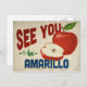 Um cartão postal encantador da viagens vintage Amarillo Texas com uma adorável maçã vermelha, juntamente com um texto divertido no estilo retrô que diz, "Até mais em Amarillo"