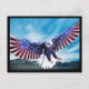 O American Eagle Postcard tem uma águia a voar com uma bandeira americana nas suas penas neste postal com vermelho branco e azul na bandeira.