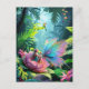 Uma menina e uma borboleta com asas iridescentes tocadas numa flor gigante numa selva exuberante, acompanhadas por um tucano colorido. Folhas grandes e flores vibrantes as cercam, criando uma cena mágica e caprichosa. Digital Art Photoshop CS6