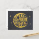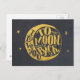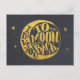 Cartão postal com um design tipográfico adorável e romântico com uma lua crescente e estrelas douradas sobre um fundo com textura de quadro-negro. O texto diz amo você até a lua e de volta, Fofo caprichoso e divertido.
