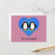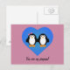 Casal de pinguins de desenho animado fofo com fundo de coração azul.