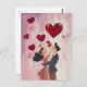 Uma ilustração encantadora e animada de um casal perdido num momento de alegria e afeto, cercado por corações vermelhos vibrantes flutuando contra um fundo rosa suave. O casal, vestido de vintage, olha uns para os outros com expressões de amor e felicidade, capturando a essência química do romance.