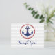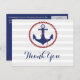 Estes cartões postais fazem excelente, agradecemos seus cartões por casamentos, chás de fraldas e uso geral! Eles apresentam uma design de cinza e listras brancas. Em cima desse fundo há um círculo vermelho de corda com uma âncora azul marinho no meio. O texto escrito abaixo diz "Obrigado".