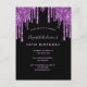 Um convite de aniversário feminino e feminino 50º (ou qualquer idade). Na frente: Um fundo preto chic. Decorado com púrpura escura e púrpura pingando, pintura pingando aparência. Personalize e adicione um nome e detalhes da parte. O nome é escrito com um script de estilo manuscrito, letras claras e roxas.