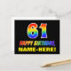 A frente deste design de cartão postal colorido, alegre e divertido aniversário com tema de aniversário apresenta um grande número "61" e a mensagem "HAPPY BIRTHDAY", ambas coloridas com um padrão inspirado no gradiente do espectro do arco-íris, juntamente com um nome de destinatário personalizado amarelo ousado. A frente também apresenta um simples fundo preto. A parte de trás do cartão postal contém uma mensagem de saudação de aniversário editável, ou talvez pudesse ser apagada e deixada em vazio se uma mensagem fosse escrita manualmente. Um cartão postal de aniversário vibrante e personalizável como este pode ser uma maneira divertida de enviar uma mensagem celebrando o sessenta aniversário de alguém. [~Z0000474]