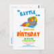 Um balão de água bateu no convite de aniversário para crianças da festa de verão. Festa de aniversário de combate de balões d'água de verão.