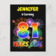 A frente desta design postal divertida e animada convite de aniversário apresenta um nome editável, um emocionante padrão inspirado em fogos de artifício comemorativos, e a mensagem "81 ANOS DE IDADE!" tendo um espectro colorido do arco-íris inspirou um padrão de gradação. A parte traseira contém uma mensagem personalizável que pode incluir detalhes sobre a festa de aniversário, como quando ela está acontecendo e onde ela está sendo mantida. Cartões-postais como este podem ser enviados a potenciais convidados de uma festa de aniversário que se realiza em comemoração do oitenta aniversário de alguém. [~Z0000452]