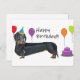 Este adorável Dachshund se vestiu especialmente para a ocasião para desejar um Feliz Aniversário ao amante de Dachshund na sua vida! Um dachshund preto e marrom em um chapéu de festa. Balões ao seu redor e um bolo aos seus pés.