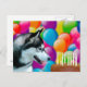Husky Siberiano preto e branco olha com fome para o bolo de aniversário de chocolate e acende velas com um cheio de fundo de balões de cão amante cartão de aniversário