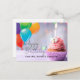 Deseje Feliz Aniversário aos seus alunos com este cartão postal personalizado. Bolo de aniversário com balões e letra cursiva e moderna. Cartão postal com verso em branco para escrever uma nota.