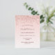 Um convite de aniversário feminino e feminino de 21 ruas (ou qualquer idade). Na frente: Um fundo rosa dourado e gradiente rosa-claro. Decorado com pingos de brilho de rosa dourado, aparência de pingar tinta. Personalize e adicione um nome e detalhes da parte. O nome é escrito com um script de estilo manuscrito, letras rosa douradas escuras. Traseira: rosa dourado, fundo cor-de-rosa pincelado e gotas reluzentes. Dica: Se você não quiser que pareça um cartão postal, clique em personalizar, vá para o verso e remova o divisor e o carimbo de posto.