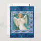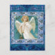 Um bonito anjo guardião com trompete. O fundo é azul.