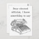 Nestes tempos turbulentos e perturbadores, é importante tomar medidas para proteger os seus interesses e promover a sua visão de como o governo deve funcionar. Entre os ciclos eleitorais, enquanto você está esperando para votar, há algo que você pode fazer. Pode escrever aos seus legisladores e outros funcionários eleitos para expressar as suas preocupações e dizer-lhes o que pretende fazer. Seja um protesto, um voto de apoio ou uma sugestão. Um cartão postal pode não parecer muita força a ser considerada, mas multiplica-o por centenas, milhares e milhões de eleitores com opiniões semelhantes e, na verdade, será uma força da natureza. Use este cartão como um getter de atenção quando ele aterrissar no correio oficial do seu escritório. É melhor escrever a sua mensagem na sua mão no verso, juntamente com o endereço de correio adequado. Você também pode editar o texto na frente para fazer o ponto um pouco diferente.
