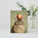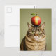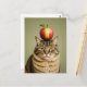 Gato engraçado com uma maçã balançando em cima de sua cabeça.