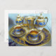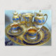 Um conjunto de bandeja de ouro e azul para café com ouro de ornamentado e copos e molhos azuis correspondentes, xícaras de café e leite e acessórios
