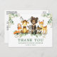 Chá de fraldas Da Watercolor Woodland Animal Obrigado Cartão-Postal. Os bebês incluem Urso, Veado, Moose, Raccoon, Coelho Coelho, Raposa e Coruja em folhas de eucalipto e verde florestal.
