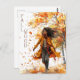 Cartão postal com ilustração aquosa de árvores com folhas em queda em cor vibrante, laranja rústica, amarelo e vermelho. Uma mulher em roupa casual de outono caminhando em primeiro plano varreu-se no vento do outono e numa espiral de folhas em queda. O script Fall Mood à esquerda das imagens em uma cor para corresponder à ilustração.