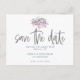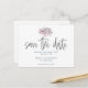 Avise aos seus convidados que você está se casando com bastante antecedência para que eles possam manter o dia livre, enviando um conveniente cartão postal para eles. Este design simples, mas elegante, tem "Save The Date" em uma tipografia cinza em estilo de letra cursiva e o restante do texto serifado é facilmente personalizado com seus próprios detalhes. Um pequeno motivo de flores em aquarela translúcida em tons de rosa e lilás está no topo. Para economizar tempo ao escrever à mão os nomes e endereços dos convidados, você também pode considerar nossos adesivos de nome e endereço de convidados individuais para seus envios de casamento disponíveis nesta coleção.