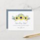 Anuncie seu noivado com o meu cartão de "save the date" em aquarela botânica de girassol, folhagens de eucalipto e azul com a frase "save our date" em caligrafia sofisticada. O cartão floral tem o verso numa cor azul sólida complementar com seus nomes e data de casamento com espaço fornecido para o endereço do convidado. Anúncio de casamento perfeito para casamentos de jardim no final do verão e outono. Para ver o conjunto de papelaria de casamento correspondente visite VG Invites no Zazzle