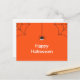 O cartão postal mostra uma aranha preta pendurada numa teia de aranha, o texto "Feliz Dia das Bruxas", e teias nas esquinas. O fundo é laranja do Dia das Bruxas. Super fofo para o Halloween, truque ou tratamento, outubro, festas, escola, compro e muito mais. Adorável, adorável design sazonal.
